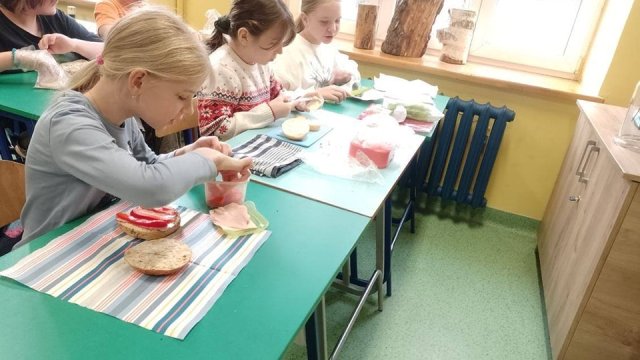 ,,Zdrowe śniadanie” w klasie 5b. Było bogato, smacznie i zdrowo. Uczniowie samodzielnie wykonali posiłek ze zdrowych produktów, następnie co do okruszka skonsumowali go.