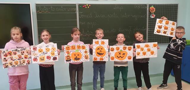 Na zajęciach koła plastycznego z okazji Dnia Pomarańczowego uczniowie wykonali piękne, kolorowe dynie, które powstały w wyniku stemplowania.