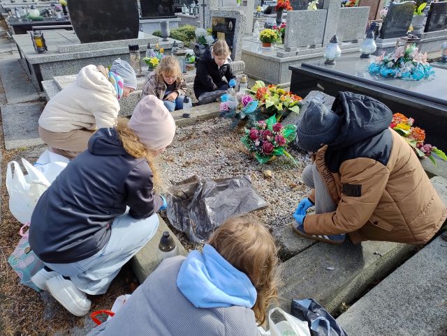 Zbliża się Dzień Wszystkich Świętych – 1 LISTOPADA. Czas zadumy, wspomnień, refleksji nad życiem. Wyrazem naszej pamięci o tych, którzy odeszli, są zadbane groby i płonące znicze. Pamiętając o byłych pracownikach Naszej Szkoły, wolontariusze ze Szkolnego Koła Wolontariatu „ZŁOTA TRÓJKA” wraz z opiekunem p. Katarzyną Łada-Wanat odwiedzili cmentarz parafialny w Oświęcimiu.