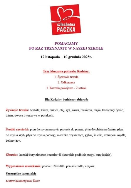 Szkolne Koło Wolontariatu „ZŁOTA TRÓJKA” zaprasza do włączenia się w przygotowanie SZLACHETNEJ PACZKI. Pomóż z nami potrzebującej Rodzinie.