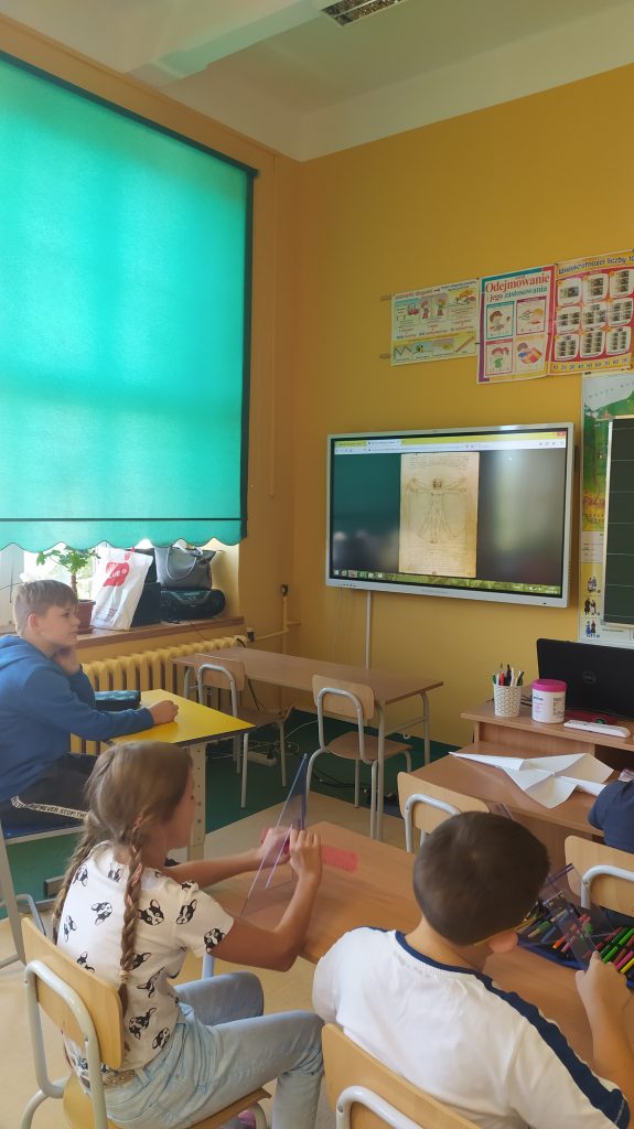 Na początku zajęć pani architekt pokazała dzieciom rysunek ,,człowieka witruwiańskiego” Leonarda da Vinci i wyjaśniła jakie są związane z nim zasady proporcji oraz w jaki sposób można ten model odnieść do pojęcia skali.