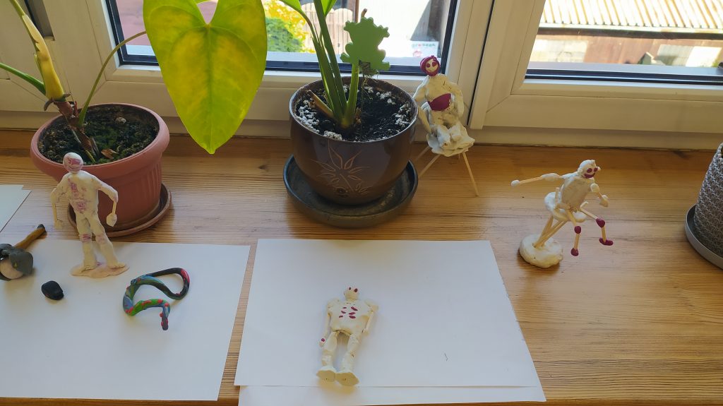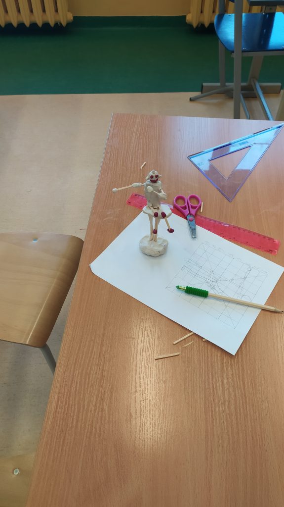 Następnie uczniowie rysowali swoje sylwetki w kwadratach na przygotowanych kartkach. Po narysowaniu formowali z plasteliny i patyczków model człowieka w nawiązaniu do wielkości sylwetki narysowanej wcześniej na kartce A4, w skali 1:10.