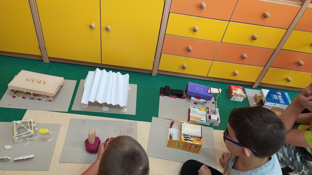 Dzieci zastanawiały się nad konstrukcją budynku szkoły, swoich domów oraz innych obiektów w ich otoczeniu. Następnie mali architekci wykonywali proste konstrukcje, wybierając technikę budowy: składanie, łączenie, ,,na sucho” i klejem, lepienie.