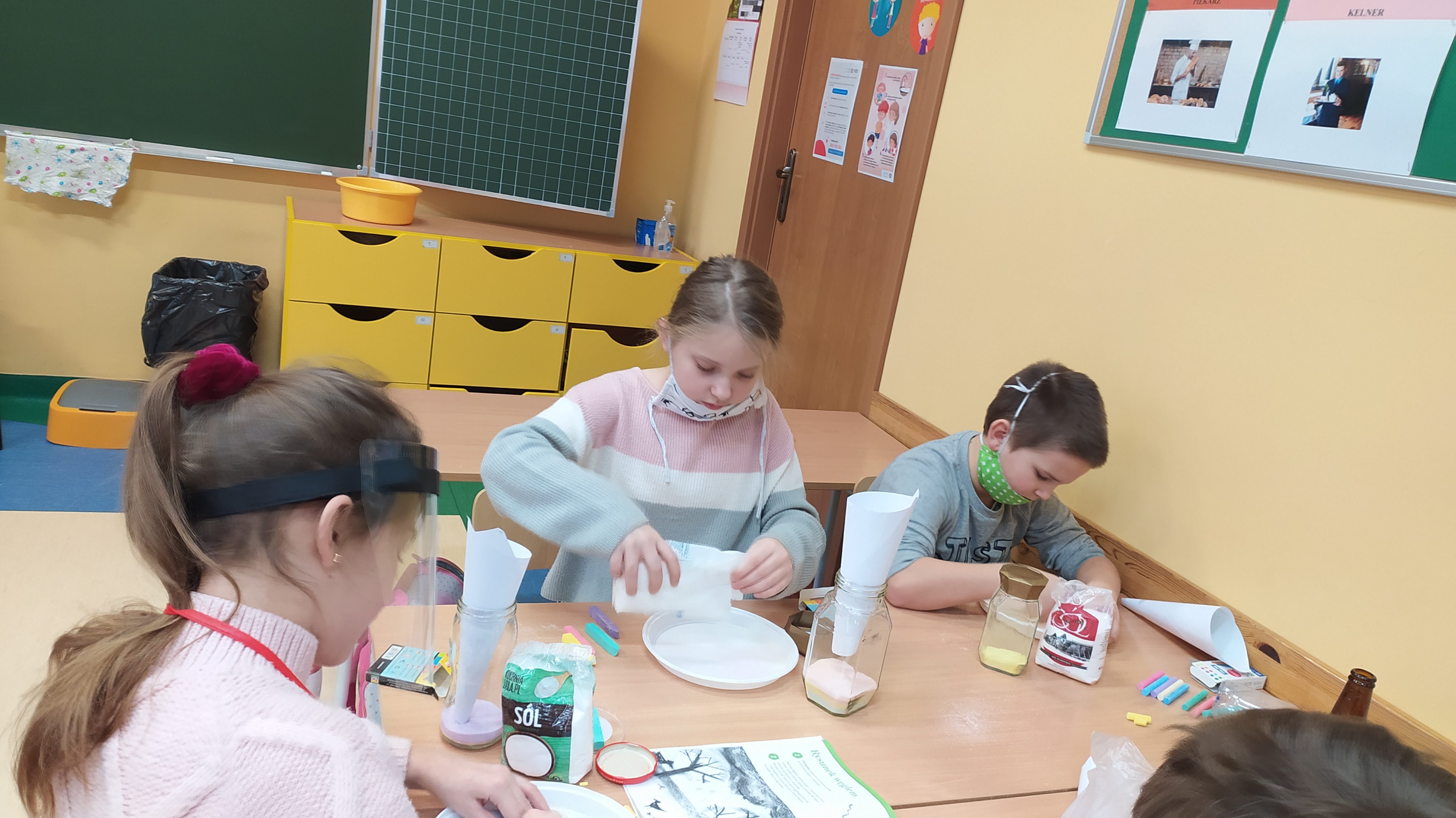 W dniu 26 stycznia 2021r. na zajęciach technicznych uczniowie klasy trzeciej pracowali bardzo kreatywnie. Mieli do dyspozycji: szklane buteleczki, słoiki, sól, kolorową kredę, plastikowe talerzyki oraz papierowe lejki, które samodzielnie wykonali. Dzieci kruszyły kredę w soli, a następnie wsypywały ją warstwami lub zmieszaną do szklanych butelek i słoików. Po  zapełnieniu dekorowały wstążeczkami. Kto by pomyślał, […]