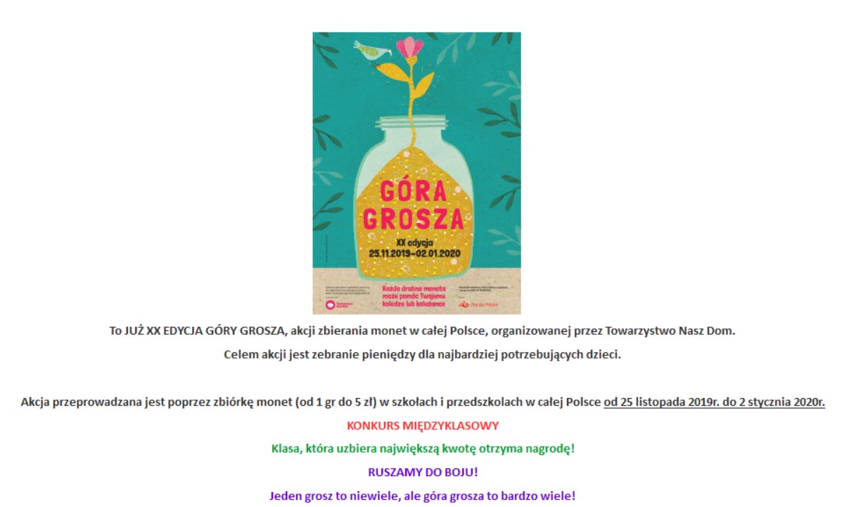 To JUŻ XX EDYCJA GÓRY GROSZA, akcji zbierania monet w całej Polsce, organizowanej przez Towarzystwo Nasz Dom. Celem akcji jest zebranie pieniędzy dla najbardziej potrzebujących dzieci. Akcja przeprowadzana jest poprzez zbiórkę monet (od 1 gr do 5 zł) w szkołach i przedszkolach w całej Polsce od 25 listopada 2019r. do 2 stycznia 2020r. KONKURS MIĘDZYKLASOWY […]