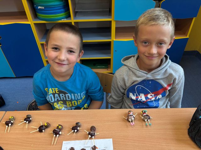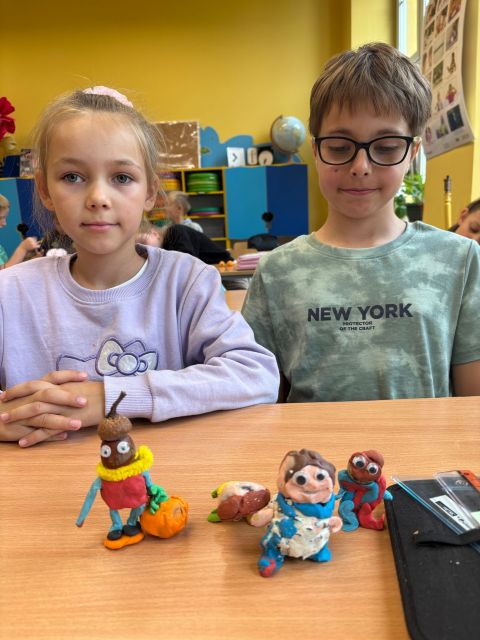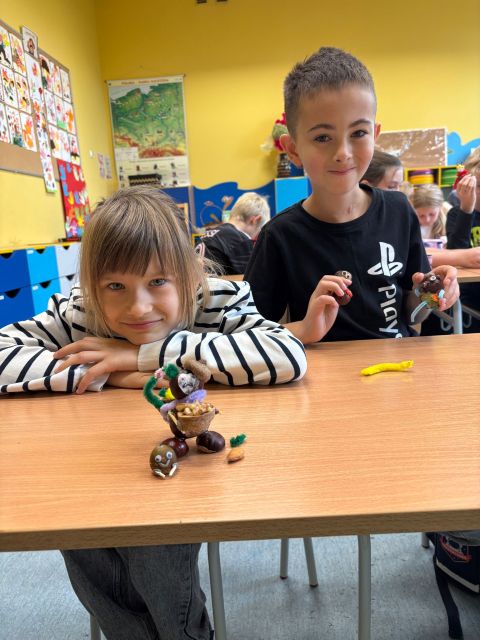 Uczniowie przygotowali kącik z darami jesieni, a sala wypełniła się pięknymi pracami plastycznymi. Na technice powstały fantastyczne figurki z kasztanów, szyszek i żołędzi, a w domu – w ramach lekcji przyrody – dzieci stworzyły piękne zielniki, które wzbogaciły nasze lekcje .