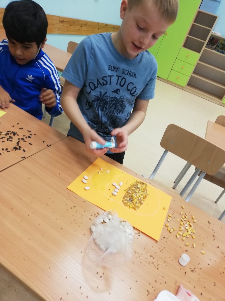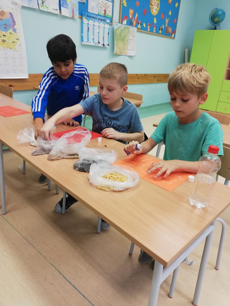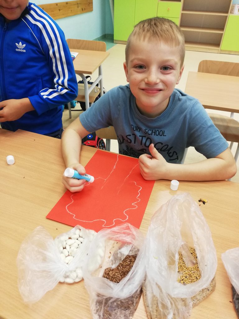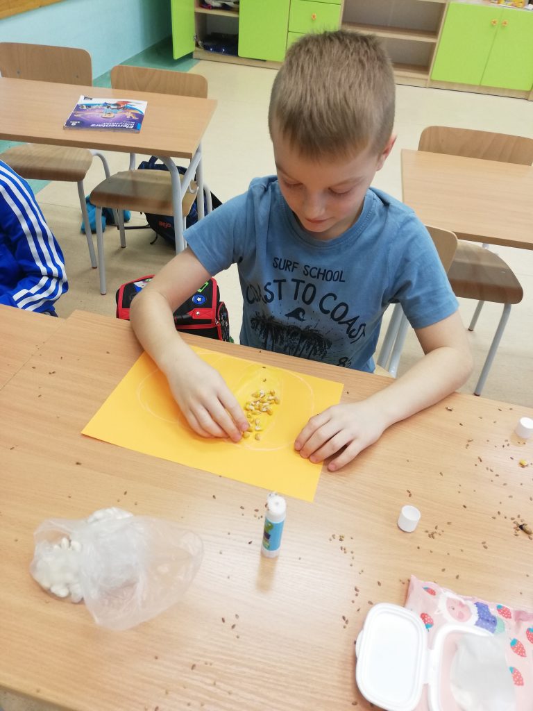Do stworzenia prac uczniowie wykorzystali fasolę, słonecznik, kukurydzę, len oraz gorczycę. Na samym początku na kolorowych kartkach dzieci narysowały szkic swoich prac. Kolejnym krokiem było wyklejenie szablonów ziarnem. Podczas zajęć pełno było wesołej atmosfery oraz uśmiechu.