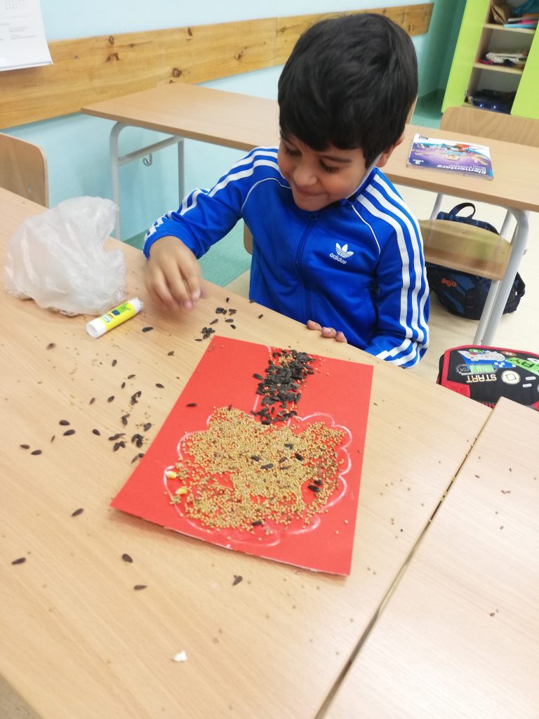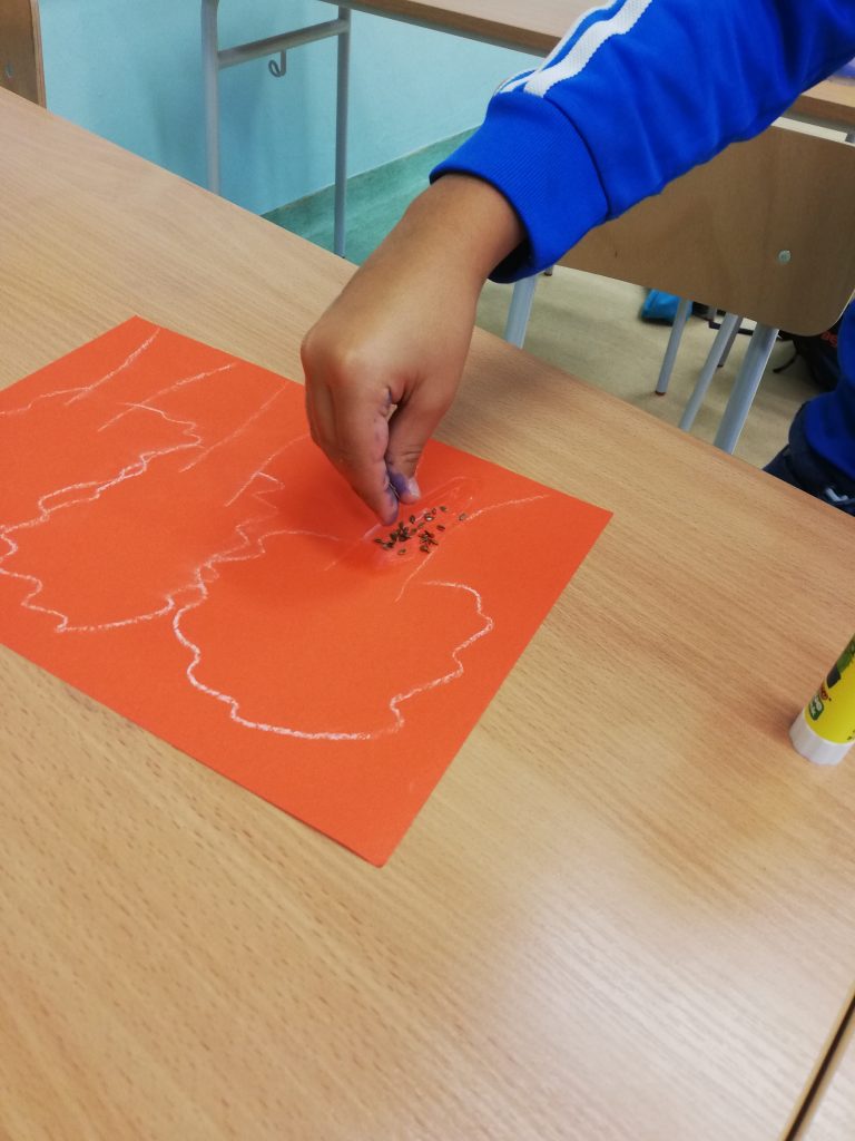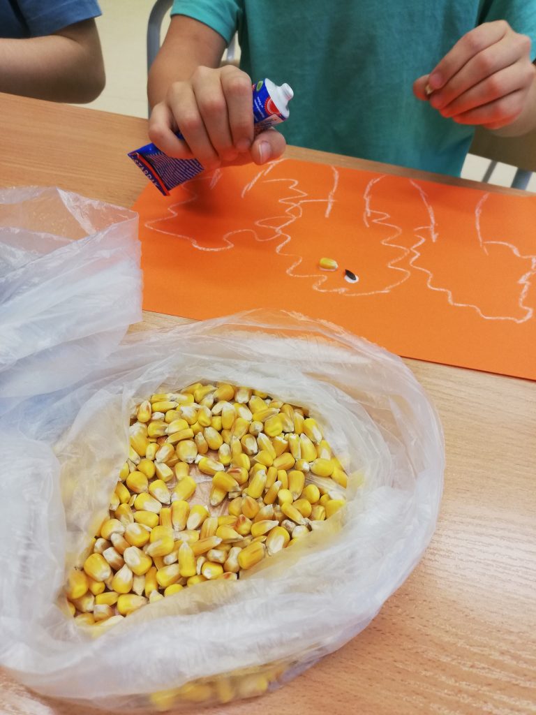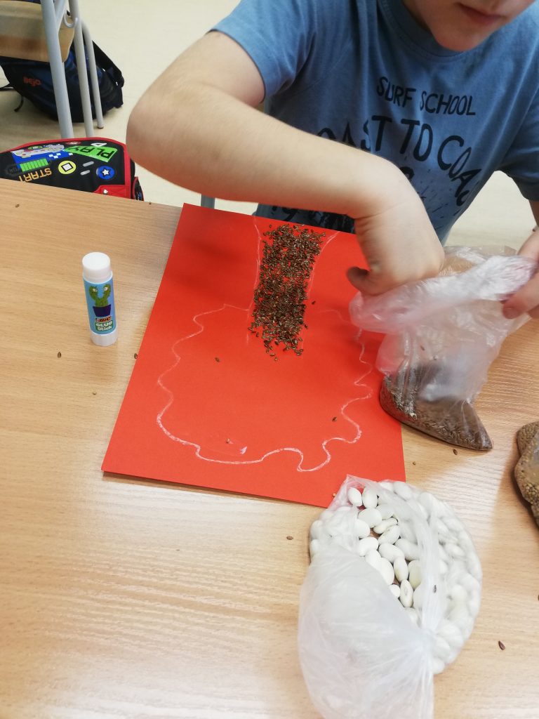 Do stworzenia prac uczniowie wykorzystali fasolę, słonecznik, kukurydzę, len oraz gorczycę. Na samym początku na kolorowych kartkach dzieci narysowały szkic swoich prac. Kolejnym krokiem było wyklejenie szablonów ziarnem. Podczas zajęć pełno było wesołej atmosfery oraz uśmiechu.