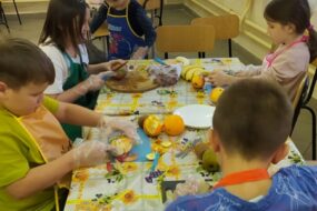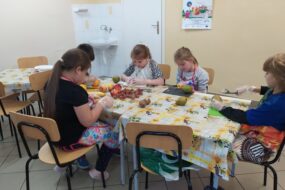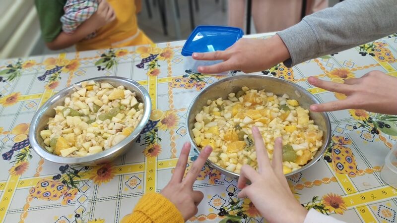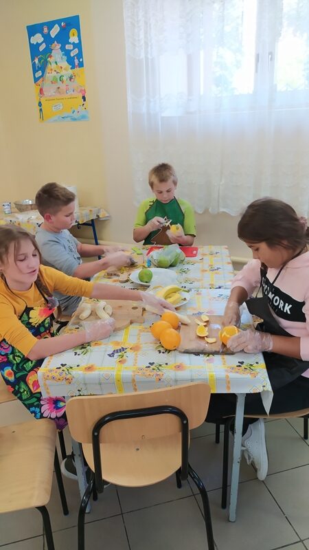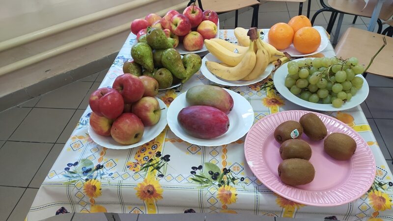 W miesiącu październiku dzieci robiły sałatkę owocową. Na początek umyły owoce, każda grupa zajęła się konkretnymi owocami (jabłka, gruszki, kiwi, pomarańcze, mango, banany, winogrono). Każda osoba oporządzała owoce: obierała ze skórki, wyciągała pestki i kroiła w kostkę. Po  przygotowaniu produktów dzieci połączyły w miskach wszystkie składniki. Następnie nałożyły sobie do pojemników i nakładały dodatki: jogurt, rodzynki, cukier wanilinowy.