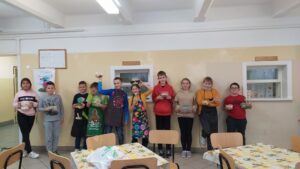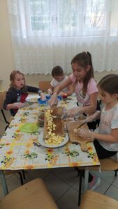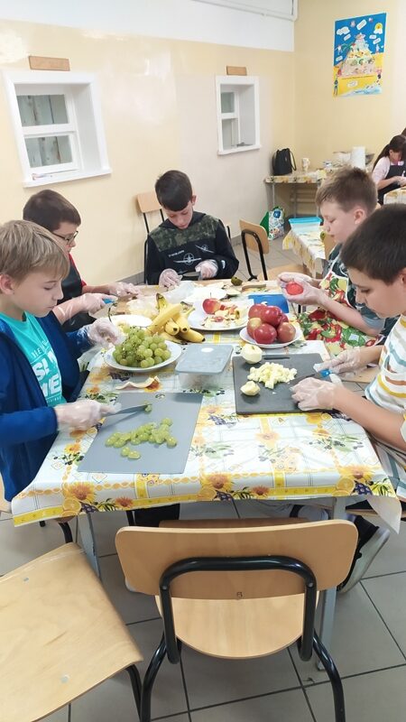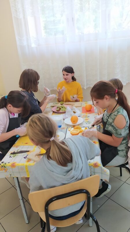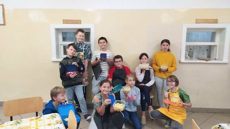 Na początek uczniowie poznali regulamin zajęć, zasady bezpieczeństwa oraz naczynia i przybory kuchenne. Uczniowie pracowali z  własnymi przyborami, a przygotowany przysmak zabrali do domu.
