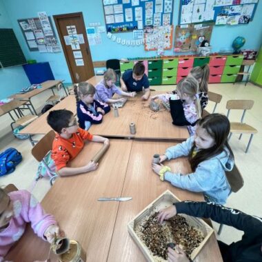 Dziś klasa 1b miała wyjątkową lekcję przyrody.  Dzieci poznały ptaki, które zostają z nami na zimę w Polsce oraz dowiedziały się, jak prawidłowo je dokarmiać.  Następnie własnoręcznie wykonały karmniki, które z radością zawiesiły na szkolnych drzewach. Lekcja przyrody w terenie sprawiła uczniom wiele radości, a nauka przez działanie okazała się świetną przygodą. Brawo dla małych miłośników przyrody!