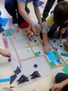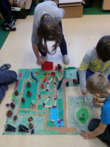 Klasa wspólnie zbudowała przyjazne miasto. Układali makiety, wyznaczali centrum, ścieżki rowerowe, parkingi, ulice, place zabaw, elementy natury. Dzieci zbudowały miasto pełne zieleni, ścieżek rowerowych, banków i sklepów. Podsumowaniem zajęć była rozmowa, czy kompozycja spełnia oczekiwania do zamieszkania.