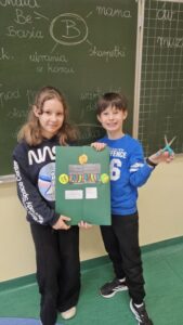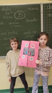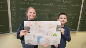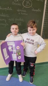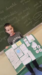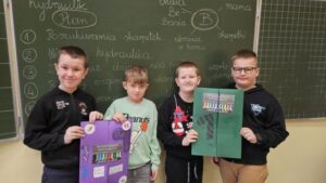 Uczniowie klasy drugiej z zaangażowaniem omawiają lekturę „Niesamowite przygody dziesięciu skarpetek”. Na jednych z zajęć dzieci pracowały w parach, przygotowując kolorowe i pomysłowe lapbooki, w których znalazły się ciekawostki oraz ilustracje dotyczące lektury.