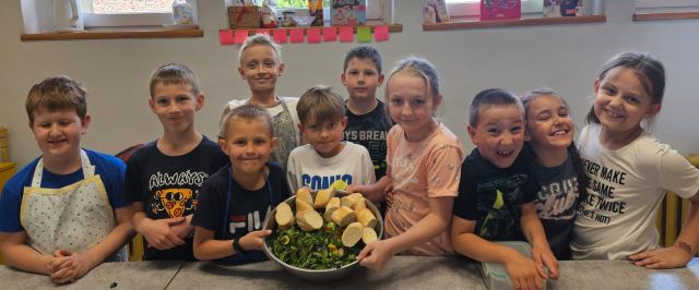 W maju nasi kucharze przygotowali wiosenną sałatkę z oliwą i chrupiącą bagietką. W trakcie zajęć dzieci pracowały z dużym zaangażowaniem, chętnie myły, kroiły i próbowały warzyw. Sałatka kusiła nie tylko zapachem, ale i wspaniałym wyglądem. Dzieci po raz kolejny uczyły się współpracy oraz doskonaliły precyzję krojenia. Dowiedziały się również, które witaminy rozpuszczają się w tłuszczach oraz w jaki sposób można przygotować dressing.