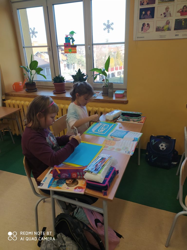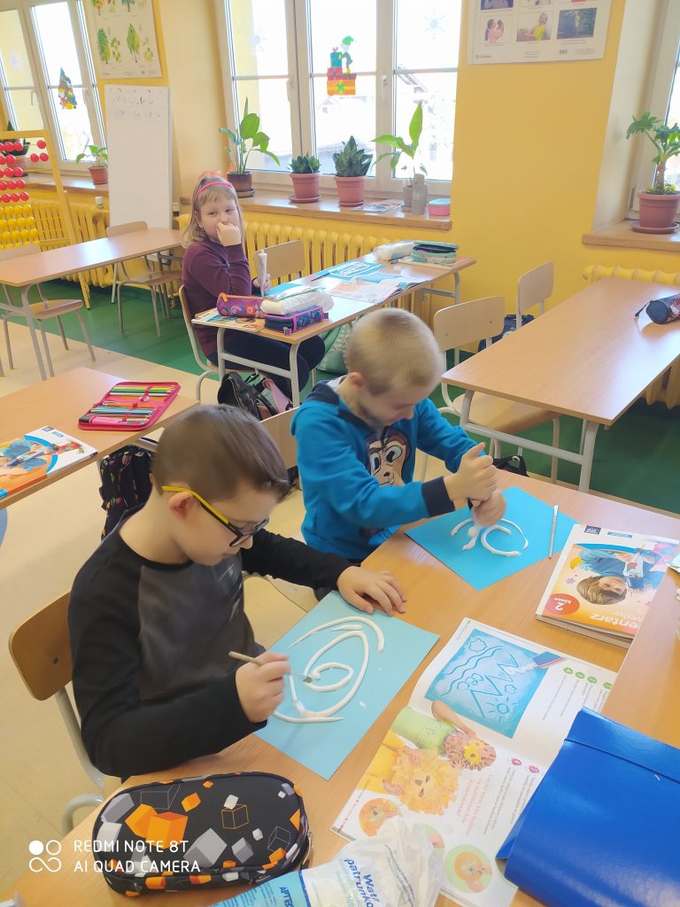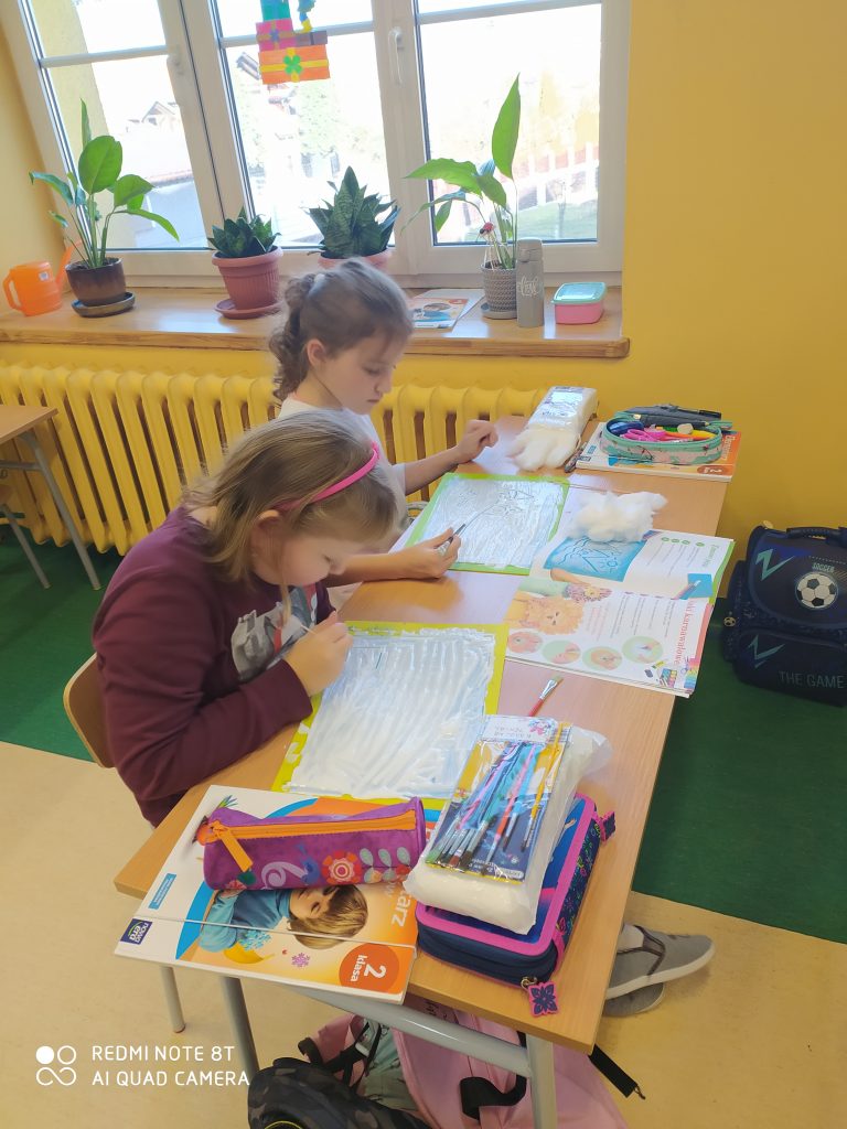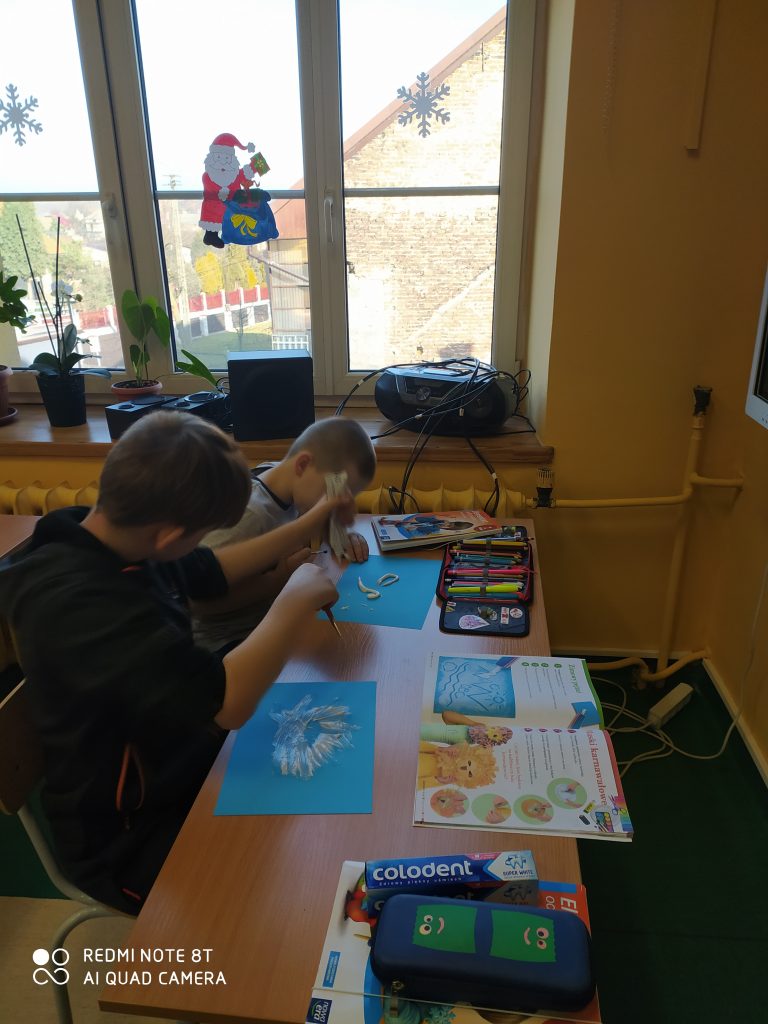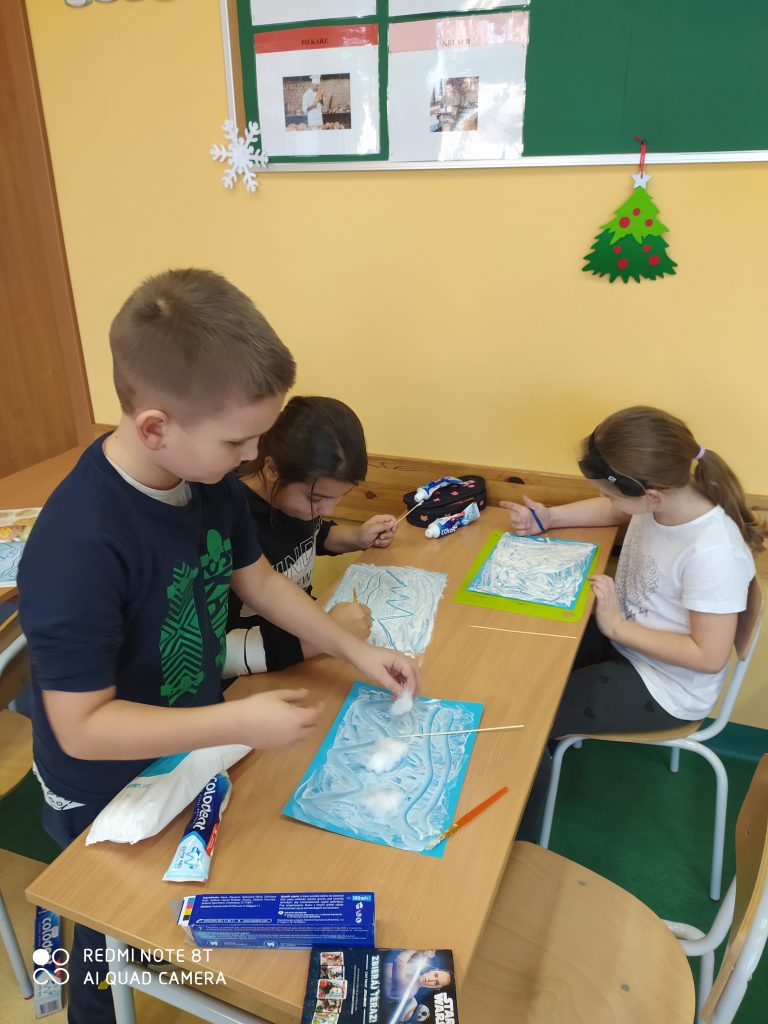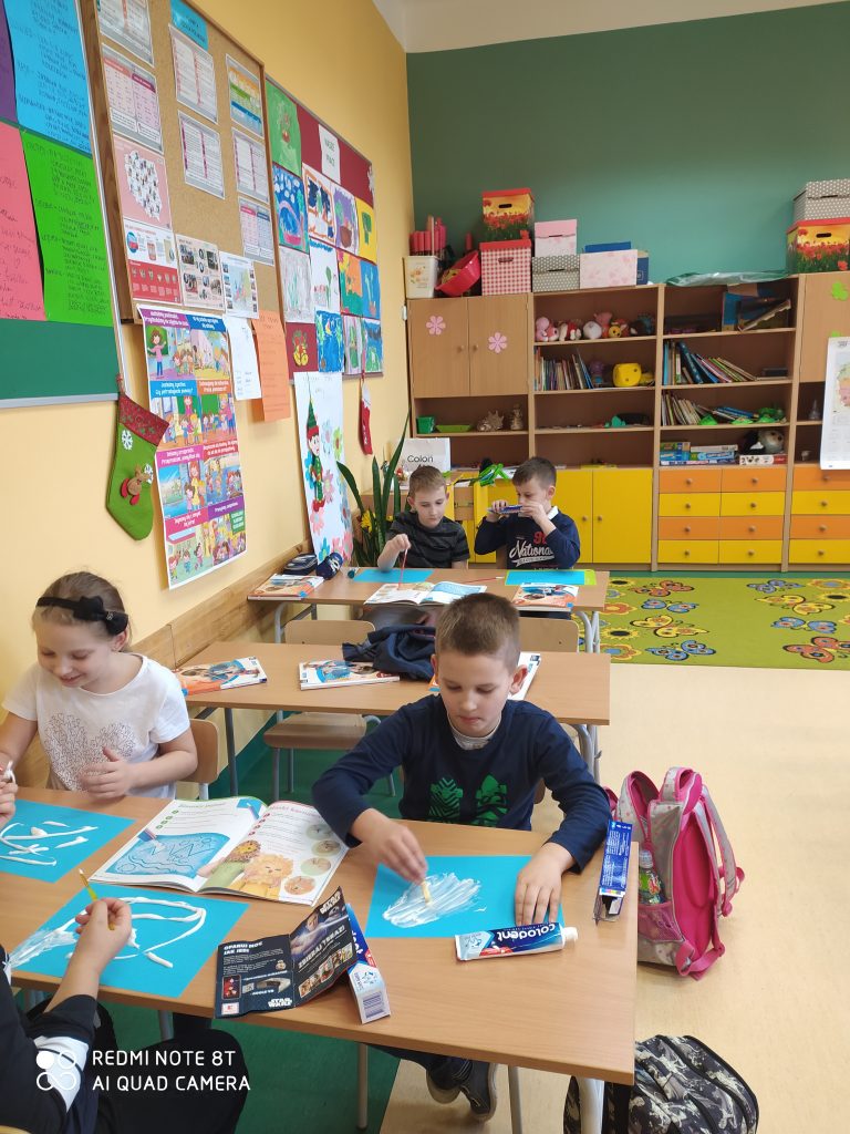 W dniu 15 stycznia 2020r. uczniowie klasy drugiej podczas zajęć z edukacji plastycznej wykonywali zimowy pejzaż.