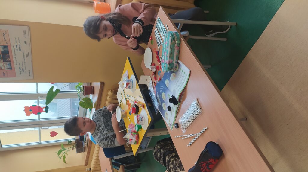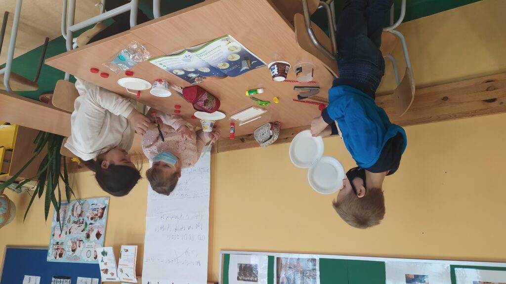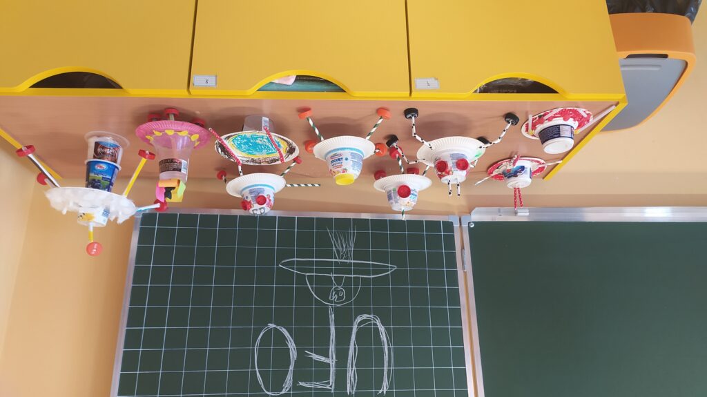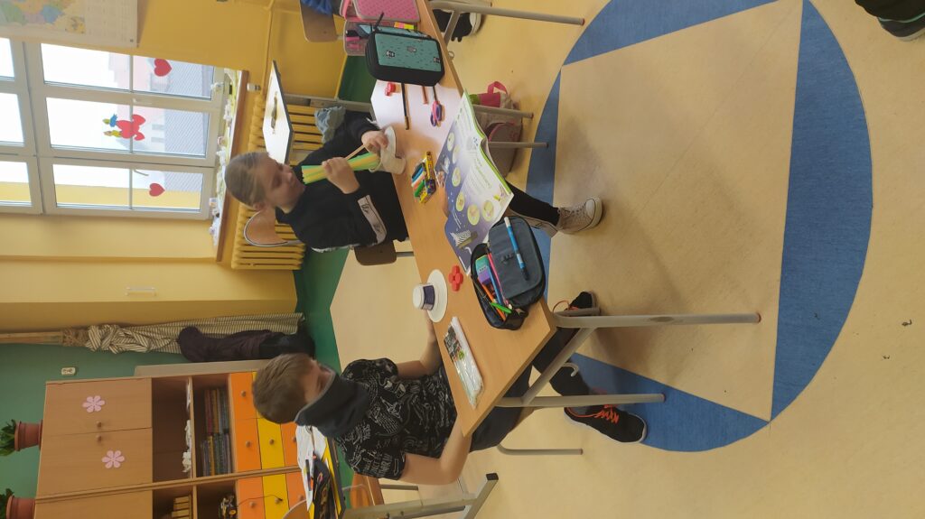 Zajęcia techniczne zawsze są bardzo ciekawe. Tym razem trzecioklasiści mając do wykorzystania: tekturowe talerzyki, jednorazowe opakowania, nakrętki, rurki do napojów, zszywacz oraz nożyczki uruchomili swoją wyobraźnię i konstruowali pojazdy kosmiczne.