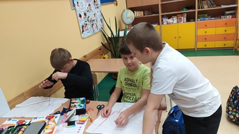 Przygotowali płótno, kolorową mulinę, igłę i nożyczki. Najpierw naszkicowali swój projekt obrazka, a potem zaczęli haftować. Tematyka pracy był dowolna. Pojawiły się: rośliny, zwierzęta, domy.